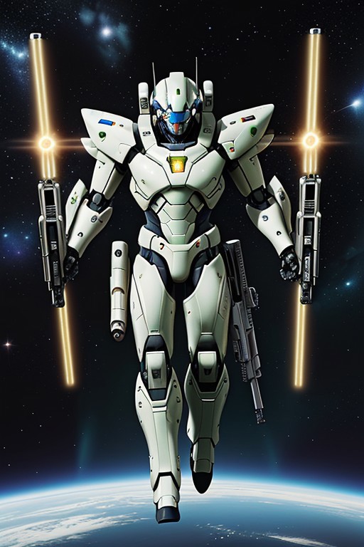 white-green mecha armor, (flying toward the viewer:1.20), armaments equipped in the armor, (right hand holding beam rifle:1.20), space in the background:0.8, (beam rifle equipment on right hand:1.3), (shield equipment on left hand:1.3)