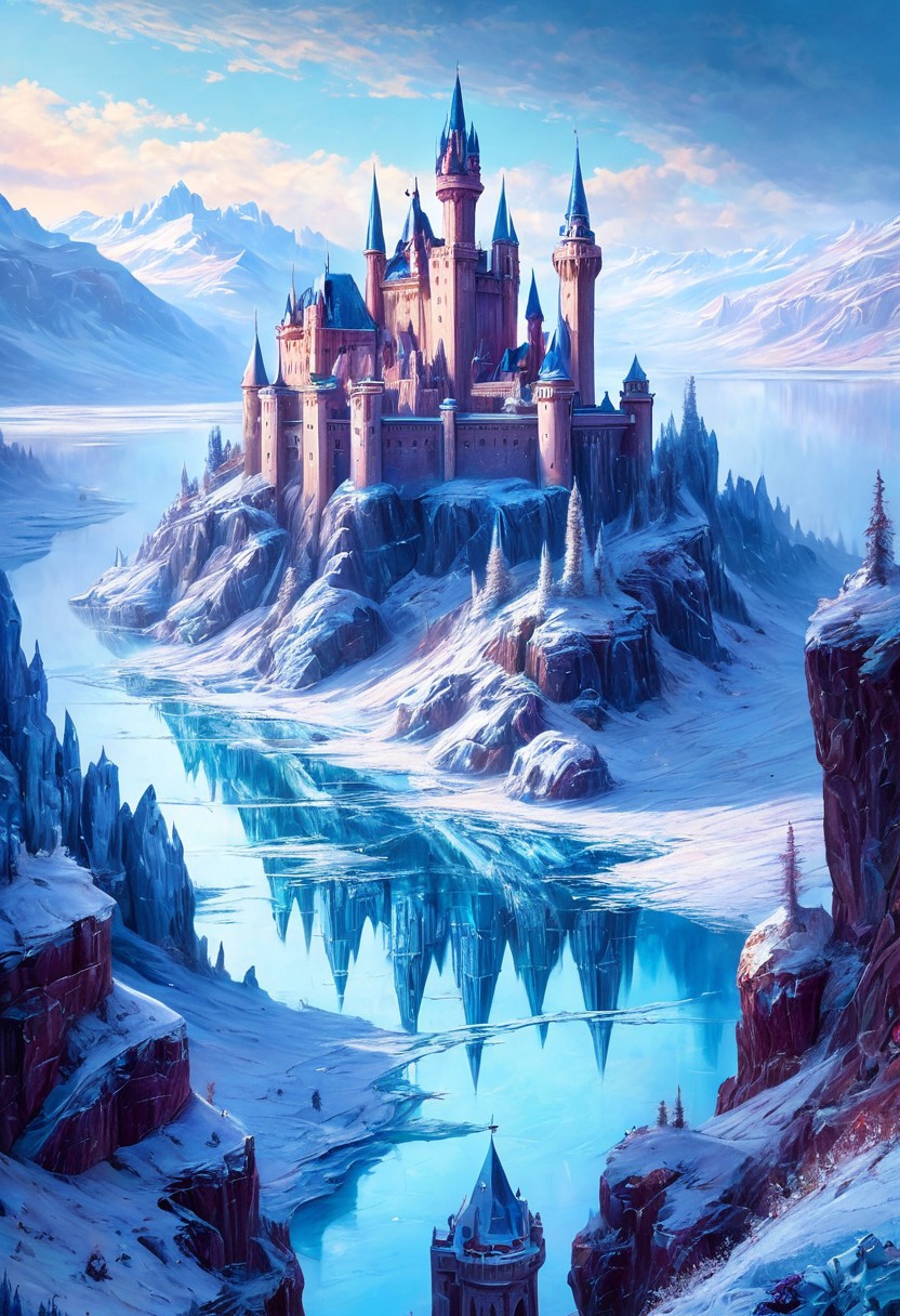 a vast, icy landscape dominated by a grand, frozen castle. The style is highly detailed and realistic, with a focus on the intricate textures of ice and snow. The castle, positioned on the right side, features numerous spires and towers, all covered in thick layers of ice, giving it a majestic yet foreboding appearance. The foreground shows rugged, snow-covered terrain with jagged ice formations leading towards the castle. The sky is overcast with heavy clouds, casting a cold, bluish hue over the entire scene, enhancing the wintry atmosphere. There are no people or text present in the image, allowing the viewer to focus entirely on the dramatic and desolate frozen landscape.charturnerv2, view,made of sparkling amethyst crystals,dungeons and dragons