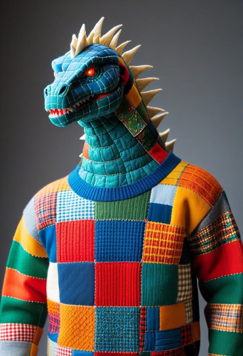 ptchkrawk, score_9, score_8_up, score_7_up, masterpiece, best quality, beautiful, perfect anatomy, godzilla, wearinig sweater made of patchwork, breathing fire,
