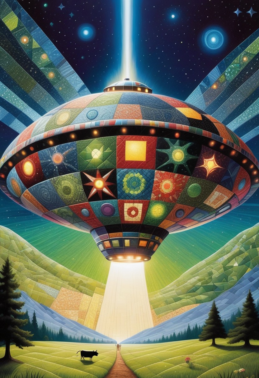 In a patchwork landscape stitched together from quiet fields and starry skies, a surreal scene unfolds. A sleek, metallic flying saucer with glowing green accents hovers above a cow made entirely of shingles, its textured body a mosaic of weathered tiles. Piloting the UFO is a green, big-headed alien, its large, curious eyes peering out from the cockpit with a mix of fascination and wonder. A bright beam of light erupts from the saucer, illuminating the shingles-cow below. As the beam intensifies, the cow begins to disintegrate, its shingle-like body breaking apart into glowing, golden fragments that swirl upward into the spacecraft. The shingles shimmer and glint, creating a mesmerizing trail of light that weaves through the air like threads in a cosmic tapestry. The surrounding field, bathed in an eerie green glow, feels both whimsical and otherworldly, a patchwork of the absurd and the mysterious. The alien’s expression is one of playful intrigue, as if it has stumbled upon the most peculiar, snack-shaped creature in the universe. This scene, a mad-shingles masterpiece with sophisticated ink-splat details, reimagines classic UFO abduction tales with a surreal, patchwork twist.
