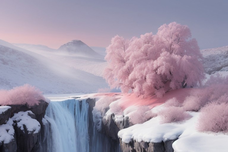 hillside of a snowy desert, outback, desert cliffs, frost, icy ice, ((pink weeping trees growing sideways off the cliff)), pink weeping tree growing off steep cliff, rocky cliffs, icicles, foggy, frozen waterfall, (protruding rocky cliffs), pink weeping trees hanging over side, freezing fog falling, hot springs, ((night time)), all trees are pink with snow cover, snowing, blue cliff rocks