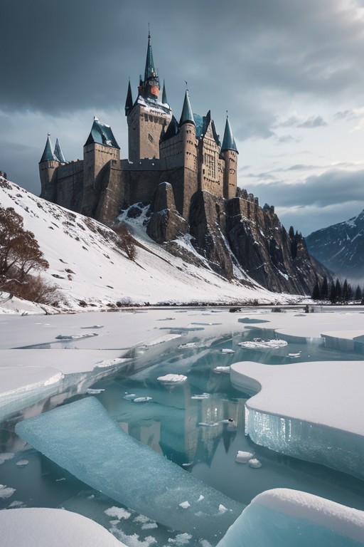 a vast, icy landscape dominated by a grand, frozen castle. The style is highly detailed and realistic, with a focus on the intricate textures of ice and snow. The castle, positioned on the right side, features numerous spires and towers, all covered in thick layers of ice, giving it a majestic yet foreboding appearance. The foreground shows rugged, snow-covered terrain with jagged ice formations leading towards the castle. The sky is overcast with heavy clouds, casting a cold, bluish hue over the entire scene, enhancing the wintry atmosphere. There are no people or text present in the image, allowing the viewer to focus entirely on the dramatic and desolate frozen landscape.charturnerv2