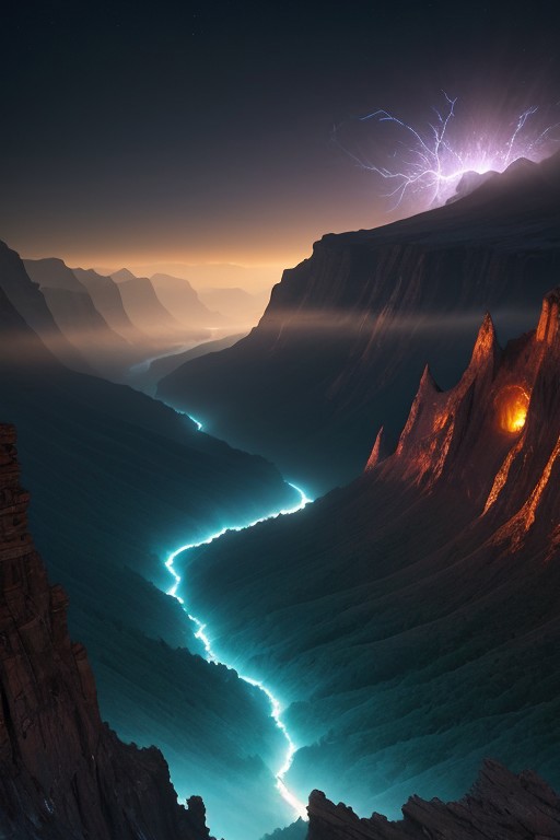 a breathtaking fantasy landscape featuring a vast, jagged mountain range shrouded in mist and glowing with ethereal energy. A deep chasm cuts through the terrain, filled with a river of crackling, violet energy that pulses with raw magical power. The dark, towering peaks are adorned with glowing fissures, leaking molten embers and arcane light. Above, a swirling vortex of storm clouds spirals around a radiant celestial rift, casting beams of luminous energy down onto the valley. Wisps of glowing blue magic flicker on distant cliffs, hinting at an ancient force hidden within the mountains. The atmosphere is both ominous and mesmerizing, evoking a sense of awe and otherworldly grandeur.