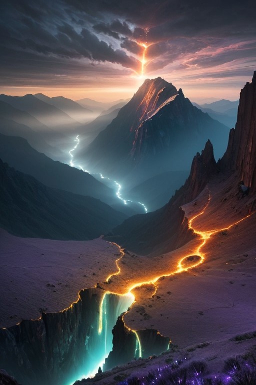 a breathtaking fantasy landscape featuring a vast, jagged mountain range shrouded in mist and glowing with ethereal energy. A deep chasm cuts through the terrain, filled with a river of crackling, violet energy that pulses with raw magical power. The dark, towering peaks are adorned with glowing fissures, leaking molten embers and arcane light. Above, a swirling vortex of storm clouds spirals around a radiant celestial rift, casting beams of luminous energy down onto the valley. Wisps of glowing blue magic flicker on distant cliffs, hinting at an ancient force hidden within the mountains. The atmosphere is both ominous and mesmerizing, evoking a sense of awe and otherworldly grandeur.