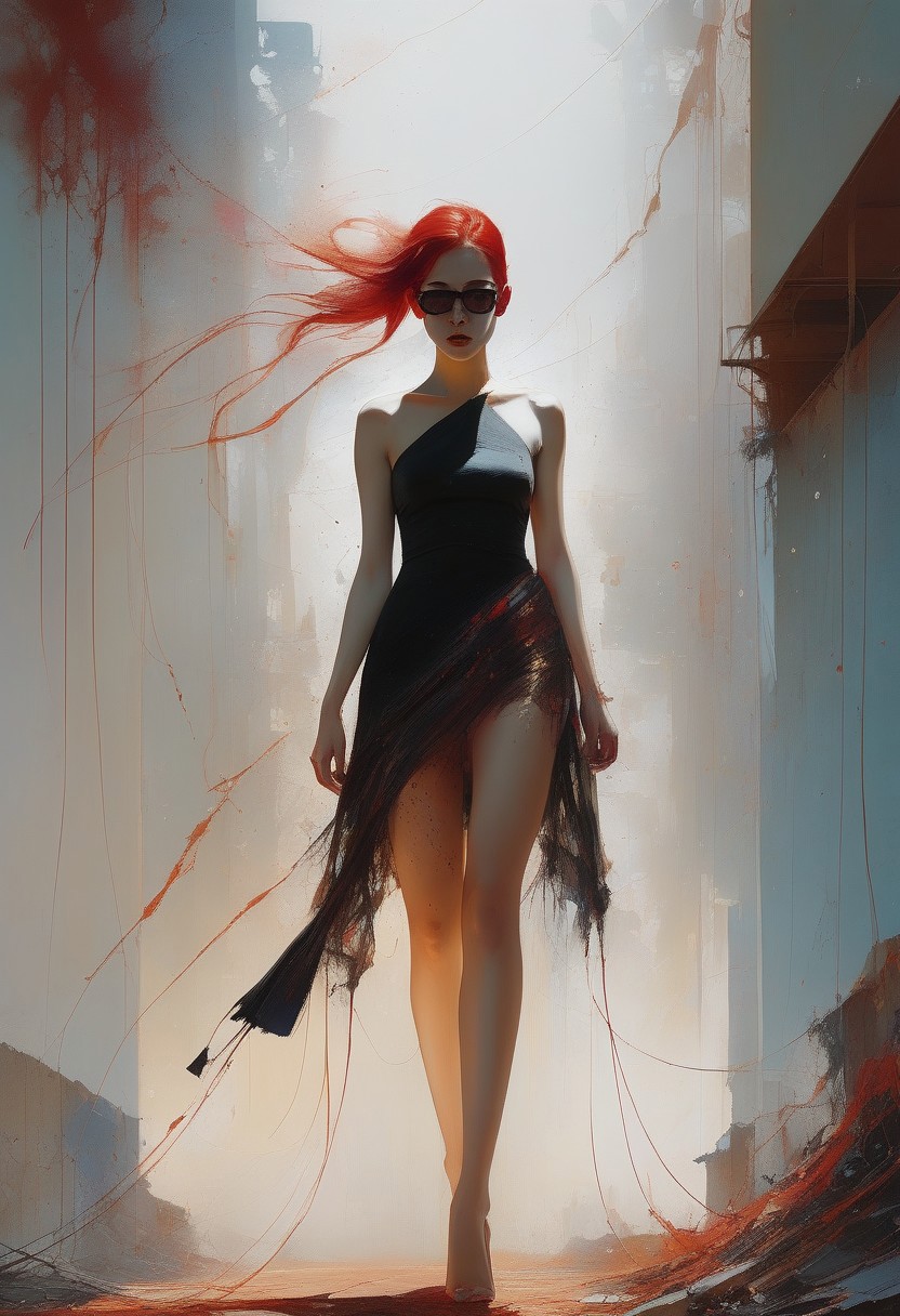 designed by greg manchess, smoke, full body shot of the most beautiful woman, bright detailed eyes, sleek scarlet hair, dense freckles, matte lips, long legs, futuristic, gold glasses, trending on art station, smoke, abstract, photoreal, by greg rutkowski, art by Carne Griffiths and Wadim Kashin, in the style of Dau-al-Set, Pollock, and inspired by MAPPA and Zdzislaw Beksinski