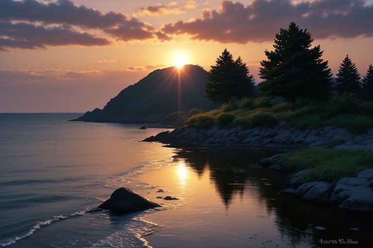 watercolor painting This image is a photograph of a painting, likely an oil painting, depicting a serene coastal landscape at awn. The scene is dominated by rising sun, casting a soft, golden glow over the water and the surrounding landscape. The sun is partially obscured by thin clouds, adding to the ethereal quality of the scene. The sky is a bright orange, transitioning into a lighter orange near the horizon, where the sunlight creates a subtle gradient., In the foreground, there is a rocky shoreline with rugged, dark rocks and shrubs. To the left, there is a tall, dark silhouette of a cypress tree, adding to the moody atmosphere. To the right of the tree, a small, rustic stone building with a thatched roof is visible, hinting at a coastal village. The water in the middle ground reflects the sunlight, creating a shimmering path that leads to the horizon. The overall mood of the painting is peaceful and contemplative, with a focus on the interplay between light and shadow. . vibrant, beautiful, painterly, detailed, textural, artistic