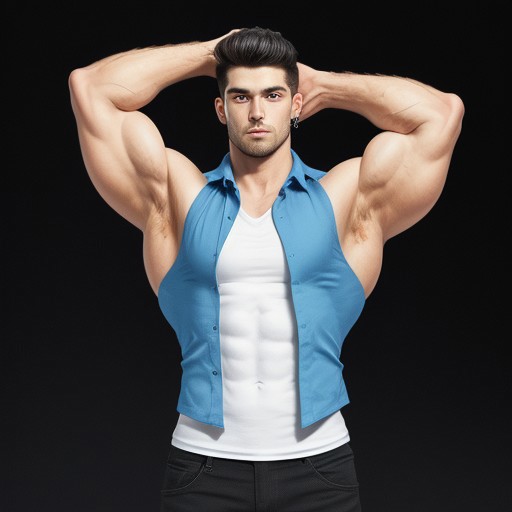 beautiful 18yo bodybuilder man posing in unbuttoned sleeveless shirt, full body shot, shirt reveals abs, messed up style hair, open shirt, cover model, skin details, bronze tan, sweaty skin, Tblack background, ultrarealistic, hyperdetailed photography, soft light, model look, looking at camera, long black hair, earrings, light blue eyes, bulging muscles, vascular, one arm is out to the side as he flexes his huge biceps, narrow waist, narrow hips,narrow pretty-boy face and he has no body hair and no underarm hair