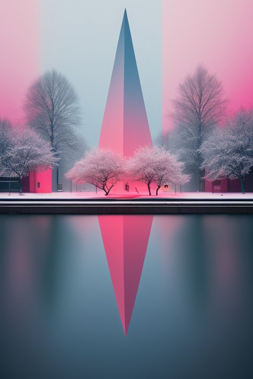 minimalism, abstract, orange, fuchsia, blue, perspective, double exposure, waterfront in winter, surreal, hyper-detailed, intricate details, professional photo, vivid colors, full-scene view