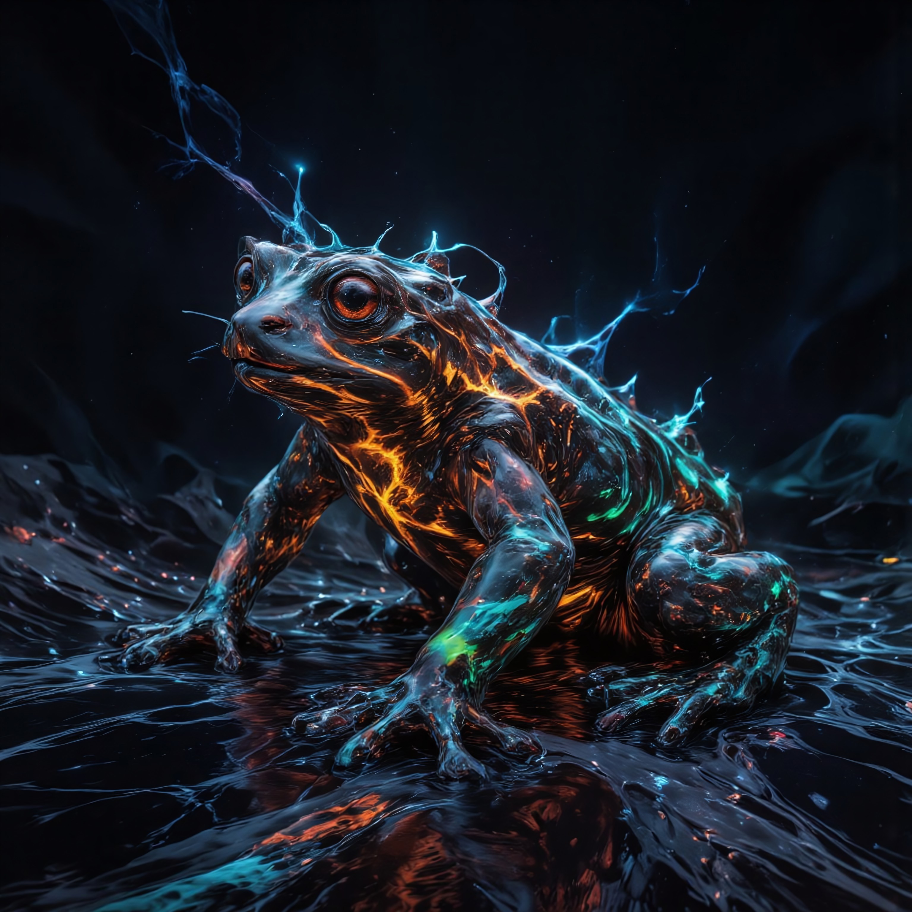 ultra detailed macrophotography of a cute multicolored glowing bioluminescent liquid marble Creature, partially transparent skin, alien micro frog per se, a housed mystical stunning (Micro puppy), mad-arcnsmbls,