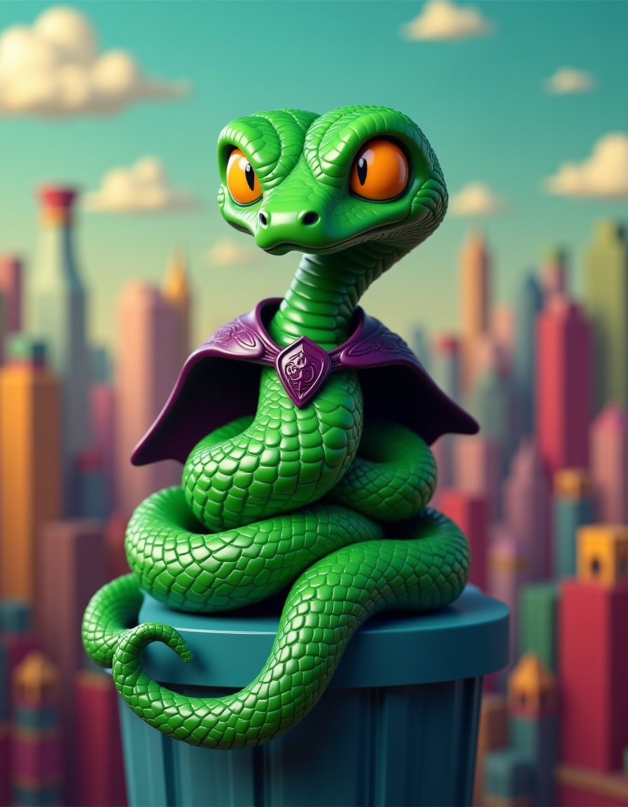 <lora:jadesnakeflux:1> An adorable jade snake, featuring the cutest design imaginable, dressed as an evil superhero with a twist of whimsy. This snake has a vibrant green body, large, expressive eyes, and a mischievous grin, adorned in a dark, dramatic superhero costume complete with a flowing cape and a striking emblem. Its outfit is a playful blend of classic superhero elements and evil flair, incorporating shades of deep purple and black. The background showcases a colorful comic book cityscape, with exaggerated buildings and a playful, action-packed atmosphere, as the snake poses heroically atop a skyscraper, ready to unleash its charmingly wicked mischief.âââ