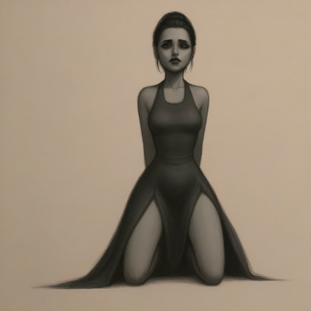 A girl in a long dress is kneeling by the grave and sobbing inconsolably (chrclCE_style, charcoal drawing)