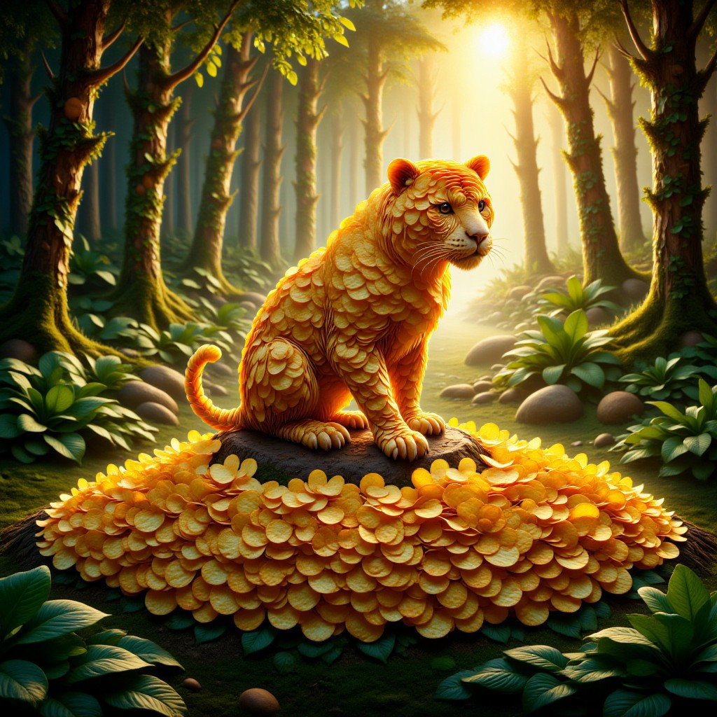 p1nkch1ps, Jaguar made of potato chips, in a jungle, golden hour,