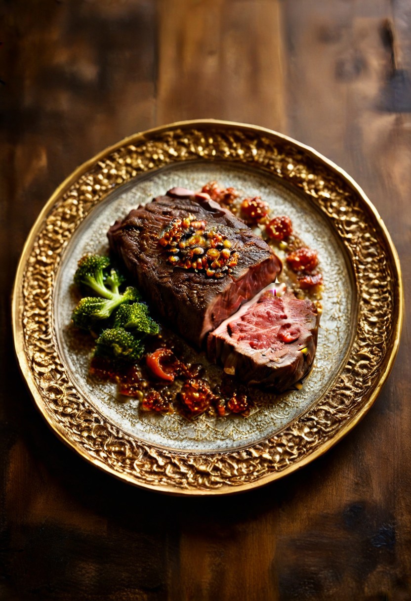 made of wagyu, Succulent steak, stake on a brass and jewels patterned ancient plate, stakehouse meal (made of wagyu, DarkAtmosCE, mtlartCE_style)