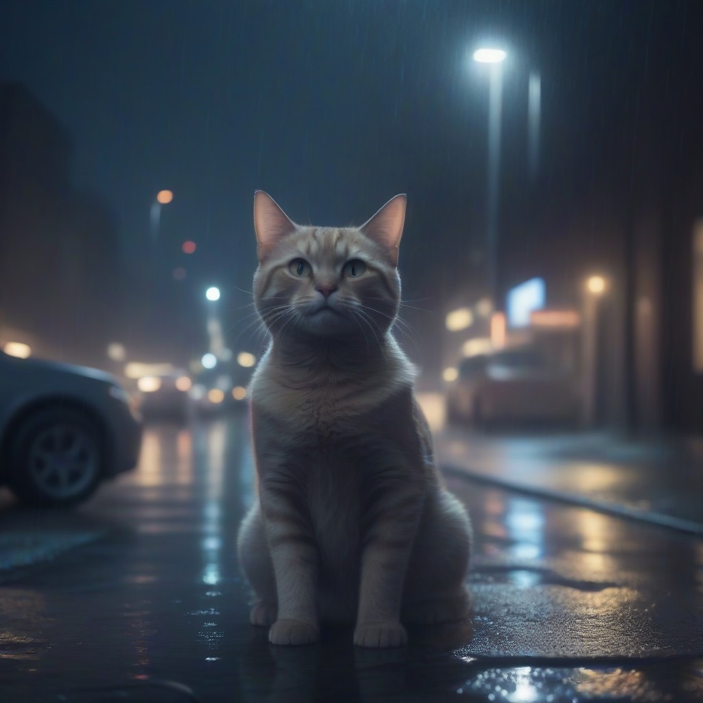in a city at night, rain, artificial light, puddles, a cat superhero to rule the city