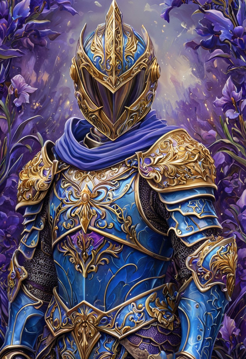 8k, score_9, score_8_up, score_7_up, masterpiece,Anime style,ultra detailed, vibrant colors, novuschroma54 style, 1boy,knight, Armor, helmet, full armor, ornamental armor, luxurious armor, Religious background, iris motif, blue and purple theme,
