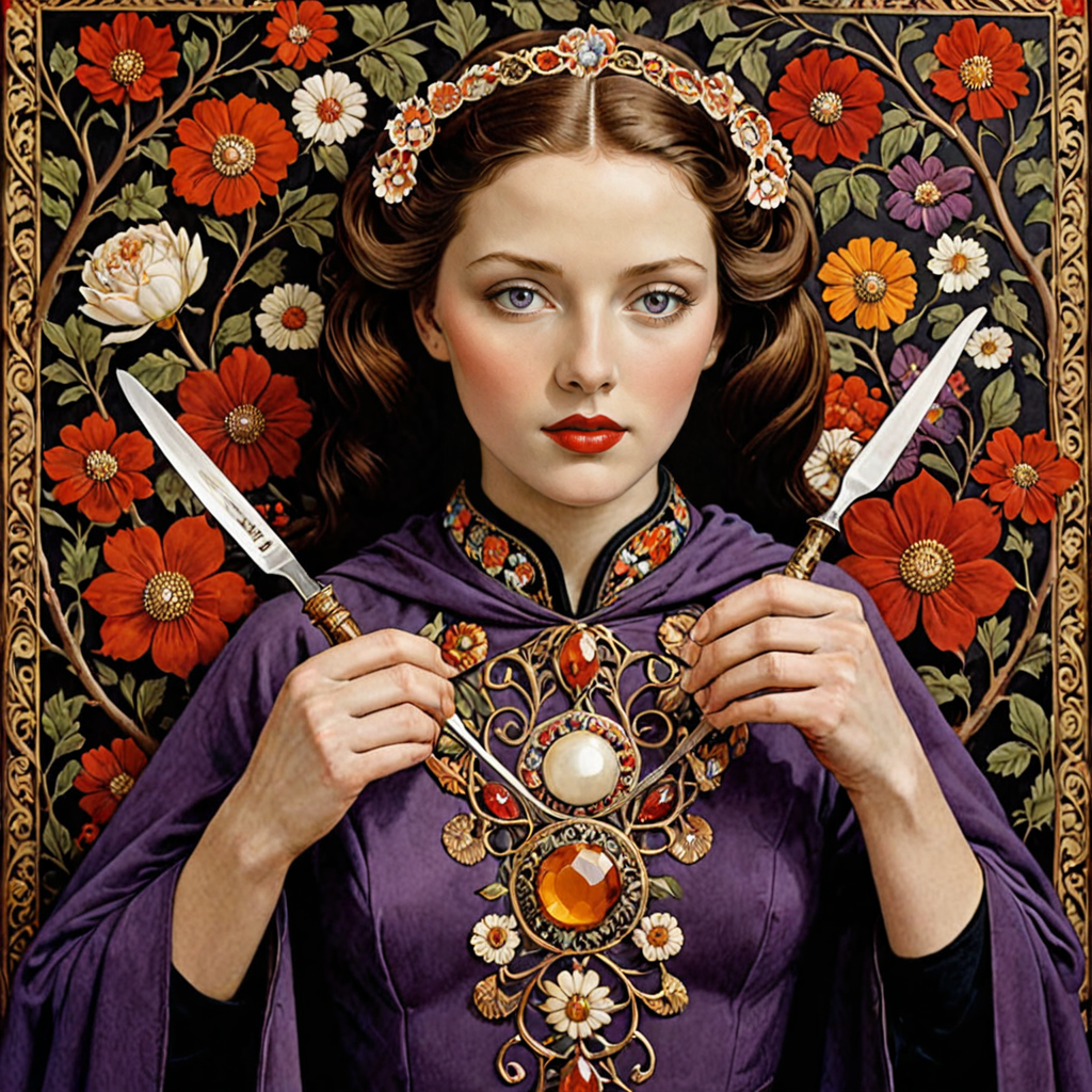 breathtaking, (Masculine Digital Artwork:1.3) of (Realistic:1.3),(Relieving:1.3) Cinnamon Brown, intricate, elements, Ivory, Ruby, Amber, Regular pattern, Topography, Animal, Flower, Ring, Fractal, Person, Object, Frame, Branches, wool, embroidery, Purpurin: A dye extracted from certain plants, used to create purple colors in textiles.,Bracelets with Hinges: Arm adornments featuring hinges for easier wear.,Shrouded Cloak: A cloak that renders its wearer invisible or allows them to blend into shadows.,Exquisite Cloisonné Vase: A vase decorated with colorful enamel and precious metal wires, creating intricate designs.,Mischievous Puppet: A puppet with a cheeky, animated face, used for humorous performances.,Simple Sling: A weapon made from a strip of leather or fabric, used to hurl stones.,Bronze Utensils: Eating and cooking utensils such as spoons, forks, and ladles made from bronze. <lora:ParchartXL-2.0:1> on parchment,(by Artist Barbara Kruger:1.3),CGSociety,ArtStation,(Abstract Expressionism:1.3),(One Color:1.3), award-winning, professional, highly detailed