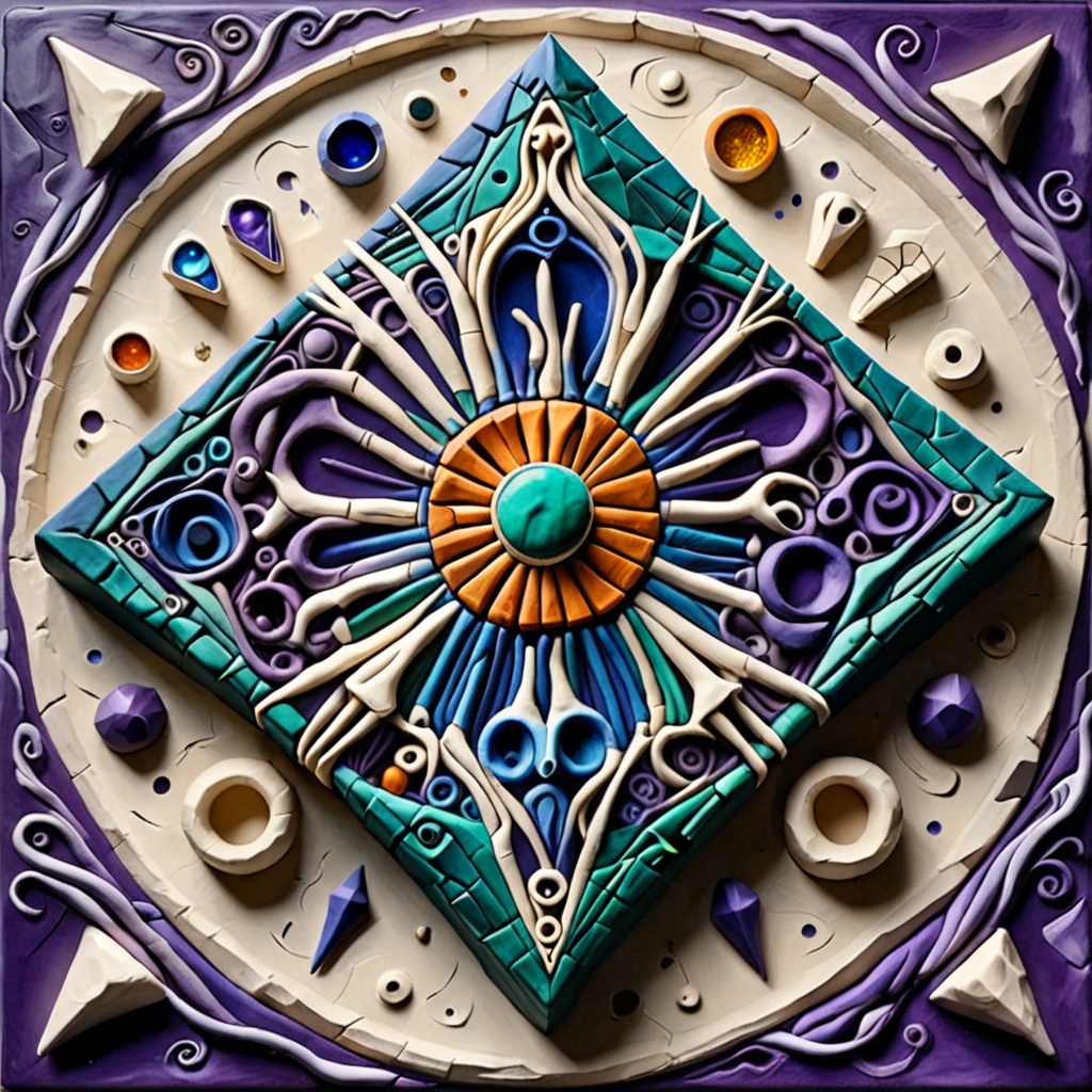 (Exciting Painting:1.3) of (Sketched:1.3),(Proud:1.3) Reflex Blue, intricate, symmetric, polygon, interconnected regions, elements, Ivory, Emerald, Amber, Silver, Topas, Mosaic, Topography, Ring, Fractal, Object, Frame, Purple Dye from Madder Root: A plant-based dye that could produce shades of purple when combined with other substances.,Sinister Music Instrument: A musical instrument that produces haunting melodies on its own.,Stone Masonry: Structures or objects built with carefully cut and assembled stones. <lora:Dark_ClayM:1> ais-drkclymtn,(by Artist Eric Kennington:1.3),(Cloisonnism:1.3),(Cold Colors:1.3)
