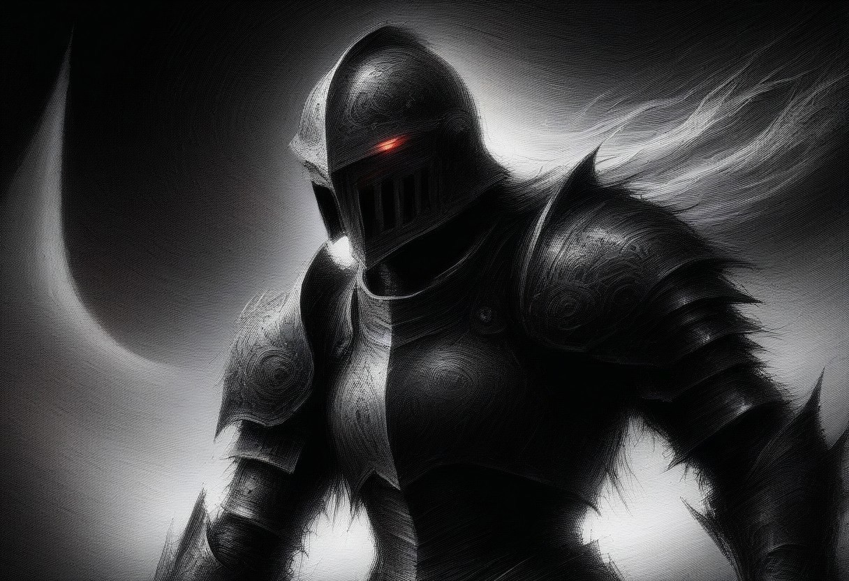 ScribbleRay, grayscale charcoal sketch, 1boy, Guts_Berserker, helmet, red eyes, glowing, black armor, clawed gauntlets, claws, torn cape, blood on clothes, cinematic angle, medieval, night, moonlight, hill, stones, starry sky, masterpiece, best quality, huge weapon, weapon over shoulder, angry, furious, fighting Dragon, Buring Forest, Black and White, Sketch, Rough Style.ScribbleRay