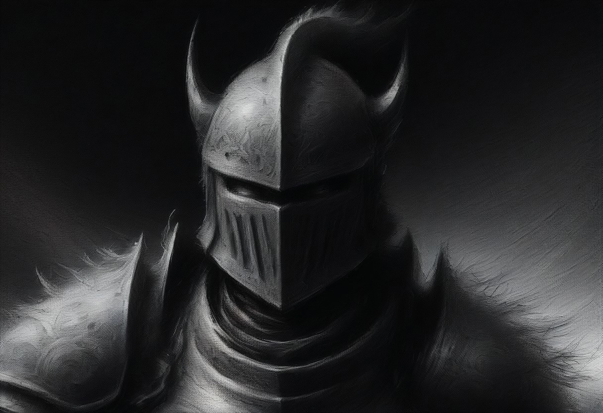ScribbleRay, grayscale charcoal sketch, 1boy, Guts_Berserker, helmet, red eyes, glowing, black armor, clawed gauntlets, claws, torn cape, blood on clothes, cinematic angle, medieval, night, moonlight, hill, stones, starry sky, masterpiece, best quality, huge weapon, weapon over shoulder, angry, furious, fighting Dragon, Buring Forest, Black and White, Sketch, Rough Style.ScribbleRay
