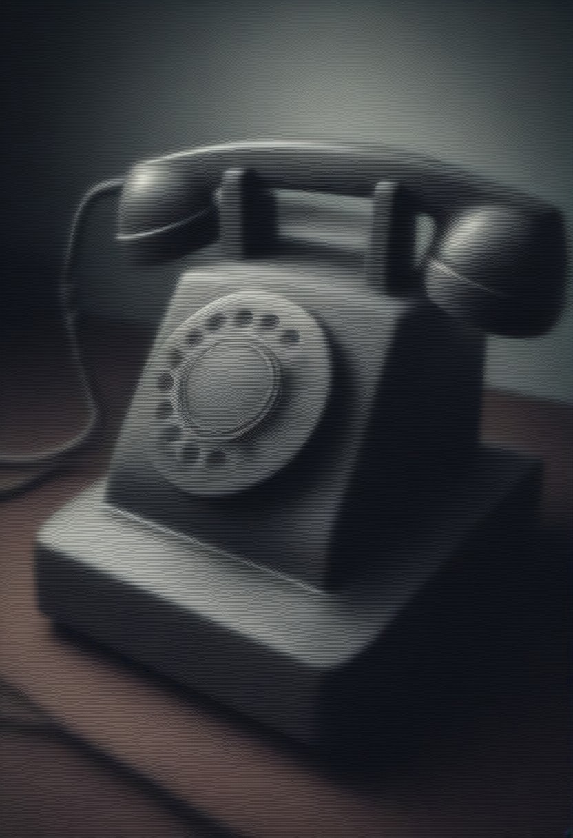distorted old phone, scrambled composition, abstract glitch art, vintage rotary phone, broken screen effect, fragmented pieces, chaotic arrangement, high detail, grunge aesthetic, eerie lighting, muted colors, noise and scratches, retro technology, surreal perspective, dreamlike distortion, artistic blur, analog textures, digital corruption, warped reality, ScribbleRay