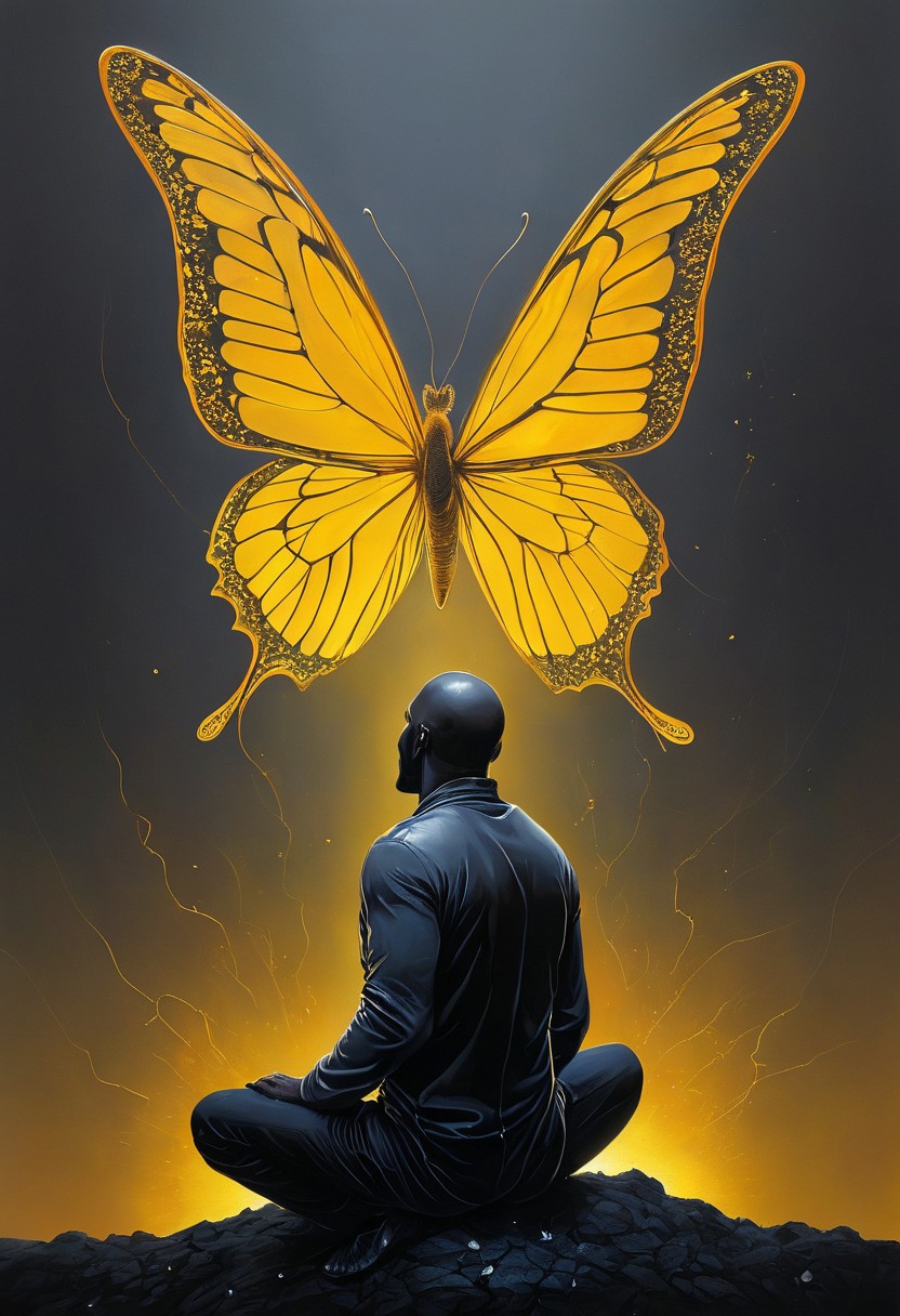 rating_safe, score_9, masterpiece, ultra quality, A somber fused glass artwork featuring a kneeling man with a ((cracked eggshell for a head))—broken where his face would be—reaching upward with outstretched hands toward a tiny, radiant, glowing butterfly. His wrists are bound by chains, evoking a sense of confinement. The background is a dark, muted gray that suggests a desolate landscape, while the only source of light is the warm, golden glow emanating from the butterfly, symbolizing escape, transformation, and liberation. The overall mood is one of isolation, hope, and longing for freedom, rendered in a primarily grayscale palette accented by that singular, transformative light.