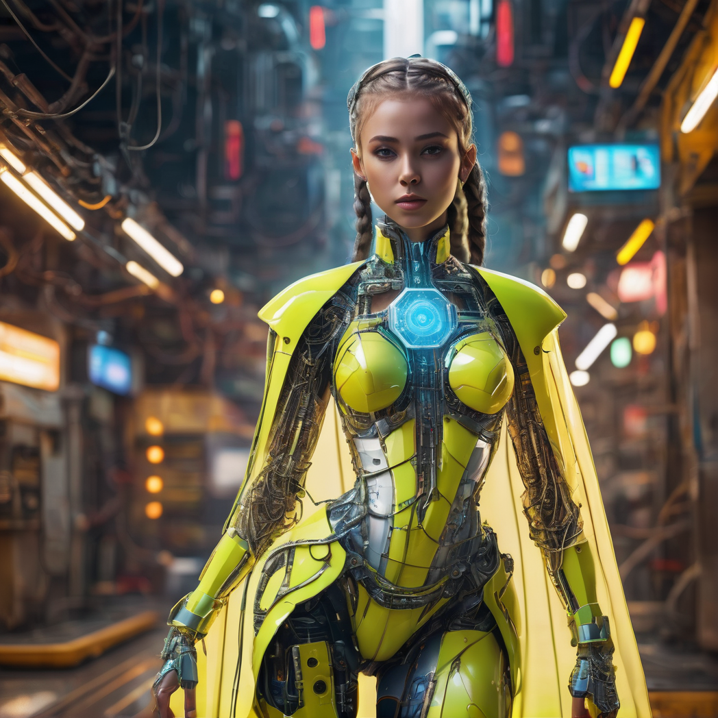 girl, woman, age 32, braided hair, full body, asymmetrical fashion, cape made of neon wires, yellow plate armor, wearing a crystalline circuit board style pendant, detailed face, realistic, exposed circuitry, android, scifi fantasy scene setting, scifi, cyborg, posing, hydraulic pistons, robotic ass