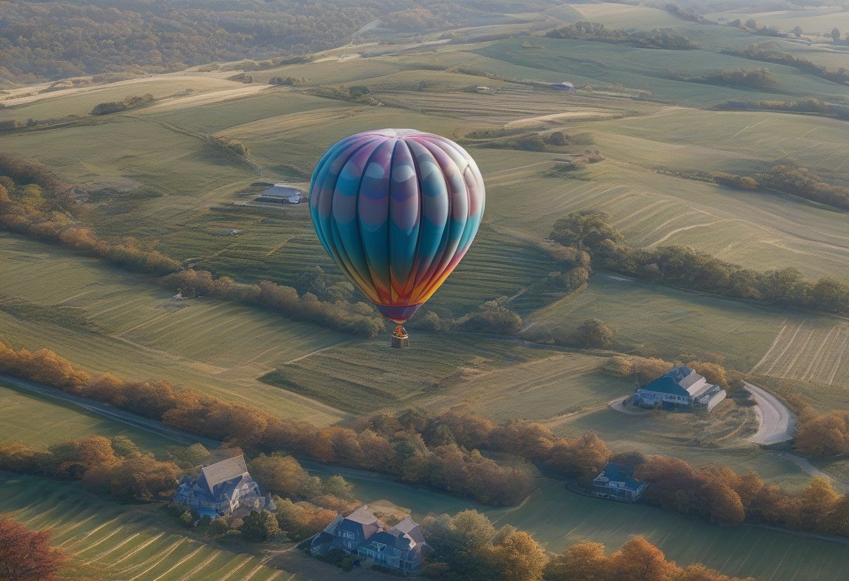 novuschroma54 style, Aerial view of a colorful glass hot air balloon (detailed balloon design (colorful checkered pattern:1.2)), floating above a landscape of glass vineyards, fields, and roads, landscape of rolling hills, farmland, buildings, road, calm atmosphere, clear blue sky, soft light, light breeze, golden hour light, high-resolution image, vibrant colors, 8k resolution.