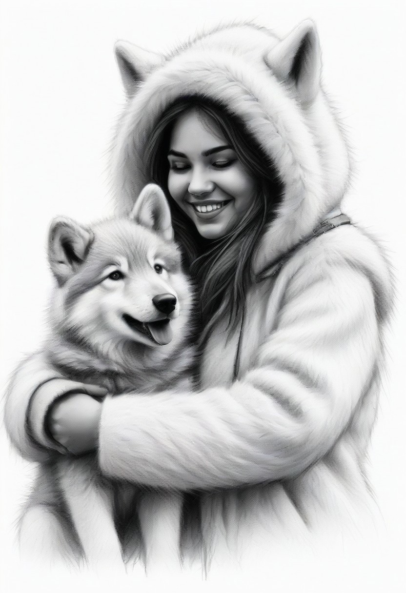 1girl, wearing a white fur coat, hood, petting a wolf pup, ScribbleRay, Eskimo, Inuit, Winter, snow, sketch, smile, cute