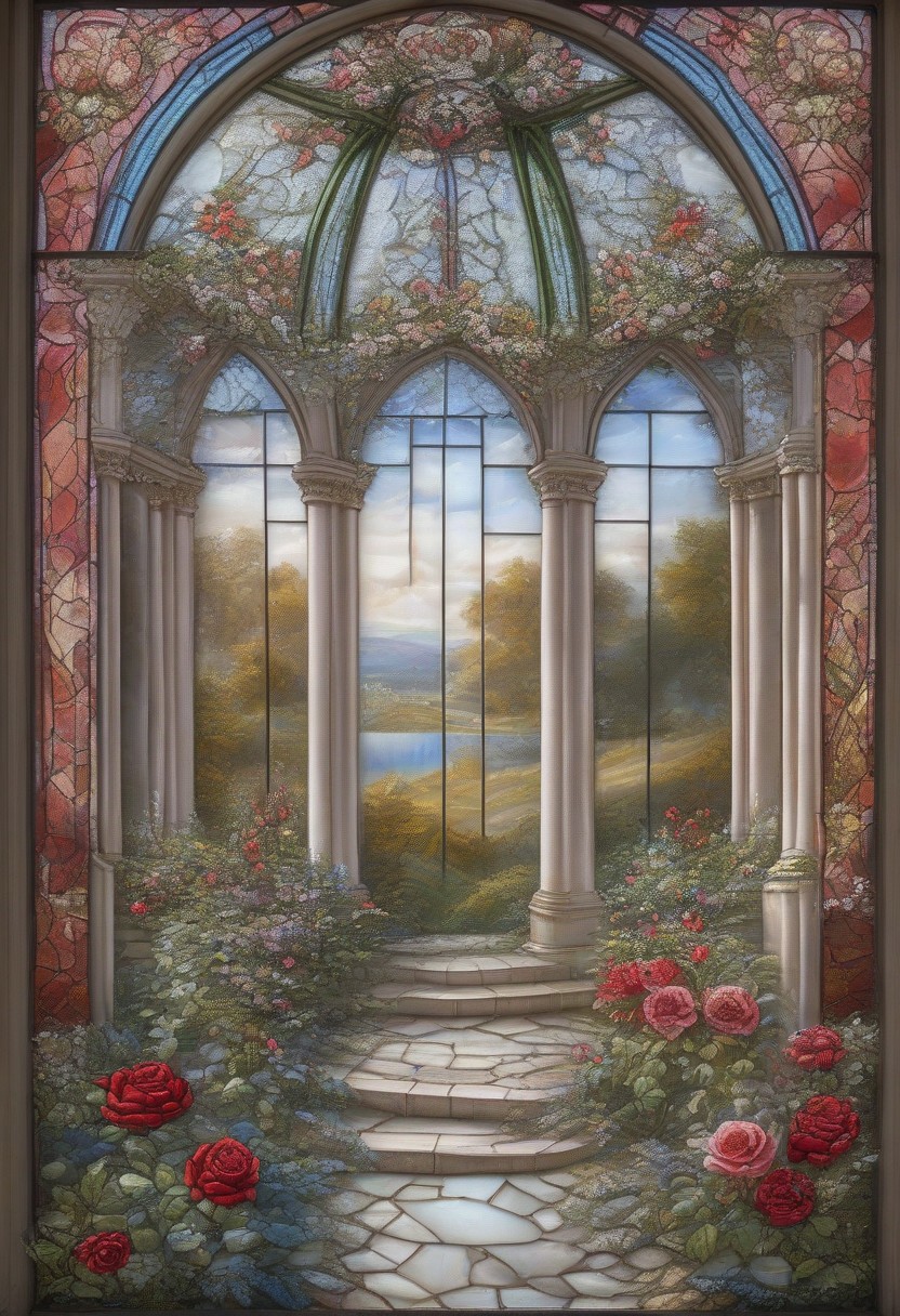 PG, novuschroma54 style, ((masterpiece, best quality)), newest, absurdres, highres, a very beautiful stained glass window depicting a white gazebo full of red roses with a garden background