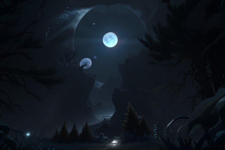 volumetric lighting, unreal engine 5, surreal, hyperrealistic, high definition, detailed, on forest ,dark blue neon eclipse on sky, sun eclipse, eclipse, dangerous waves , natural lighting, cinematic camera shot , blue eclipse