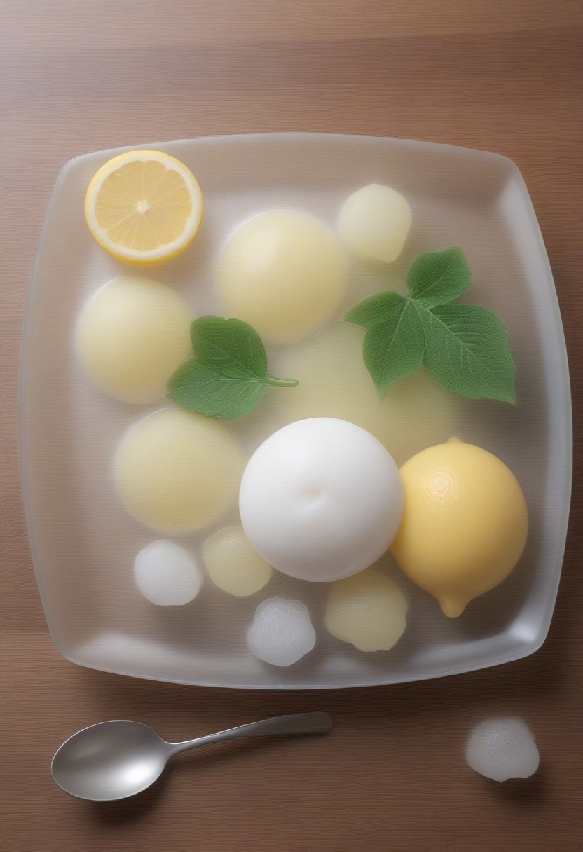 Food photo, (masterpiece: 1.12), (16k UHD: 0.81), (hyperrealism photo: 1.14), (incredible realism: 1.08), (intricate detail: 1.12), (highly detailed), (high resolution: 1.17), on a wooden table in a glass plate, diced Candy and lemon sorbet cubes, garnished with a candy and small lemon leaf, a spoon beside the plate. Fused glass style.