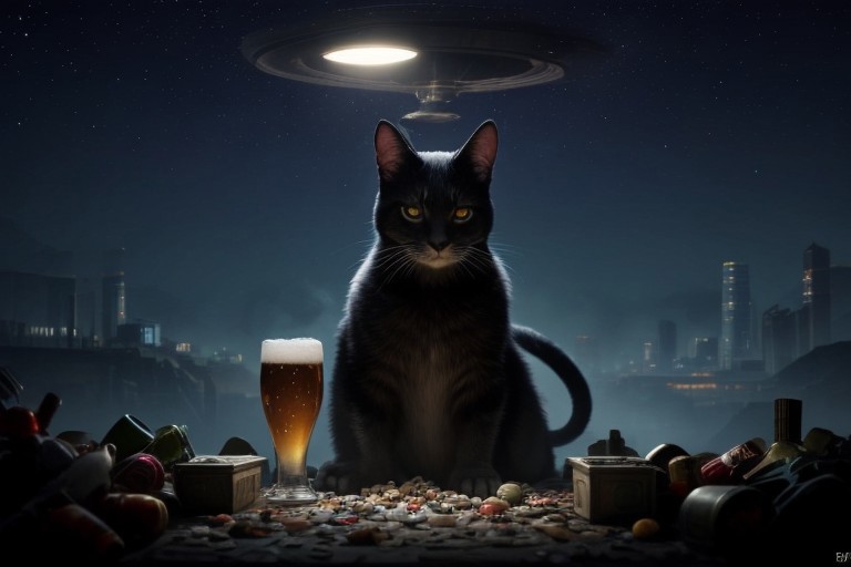 (((area 51))), ufo, apocalypse, cat, crown, many cats, chibi, cute, sparkles, cat, food, machine, mouse, war,, bullets, gun, rpg, blood, fire, waste, trash, (night city crowd background), building, beer, vodka, whiskey, scotch, blood, fight, ((((drunk)))), journal cover, text, (((big text))) sn7ddrn76dr7ndr6drn76drndr6nrtd8r6d