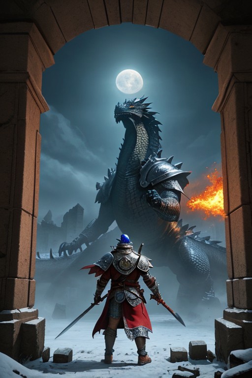 Amidst the ruins of an ancient Nordic tomb, a lone Dragonborn warrior stands defiantly against a colossal, ancient dragon. Snow and dust swirl through the air as the dragon, covered in jagged obsidian scales with glowing runes etched into its body, unfurls its massive wings, shaking the very foundation of the tomb. Its piercing yellow eyes lock onto the warrior as it roars, sending a shockwave through the crumbling stone pillars and frost-covered statues. The Dragonborn, clad in rugged Nordic armor, grips a flaming greatsword, its blade crackling with arcane energy. The warrior’s stance is firm, ready to unleash a mighty Thu'um, the ancient words of power resonating through the battlefield. Wisps of blue spectral energy swirl around the ruins, remnants of lost souls bound to the tomb. Above, the moonlight pierces through the cracked stone ceiling, illuminating the battlefield as legend and destiny collide in an epic battle of fire, steel, and dragon’s wrath.
