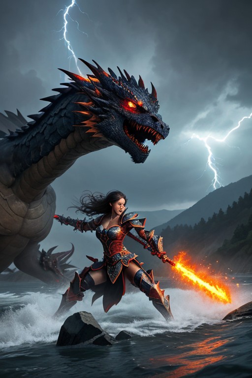 A powerful warrior woman stands on the rocky edge of a vast, ancient lake, locked in battle with a colossal, ancestral dragon. Her fierce eyes glow with raw magic as she channels a storm of destruction—her right hand crackling with massive arcs of blue lightning, while her left conjures a blazing inferno of fireballs. Dressed in intricately engraved Nordic armor, reinforced with glowing runes, she braces against the howling winds as the dragon roars, its enormous wings stirring waves across the dark waters. The beast, covered in obsidian-black scales streaked with glowing veins of energy, hovers above the lake, its piercing red eyes locked onto its challenger. Thunder rumbles as bolts of lightning strike the water’s surface, sending shockwaves through the misty air. The reflection of the raging battle dances across the lake, illuminating the jagged cliffs and towering ruins that frame the scene. The battle of fire, storm, and fury has begun.