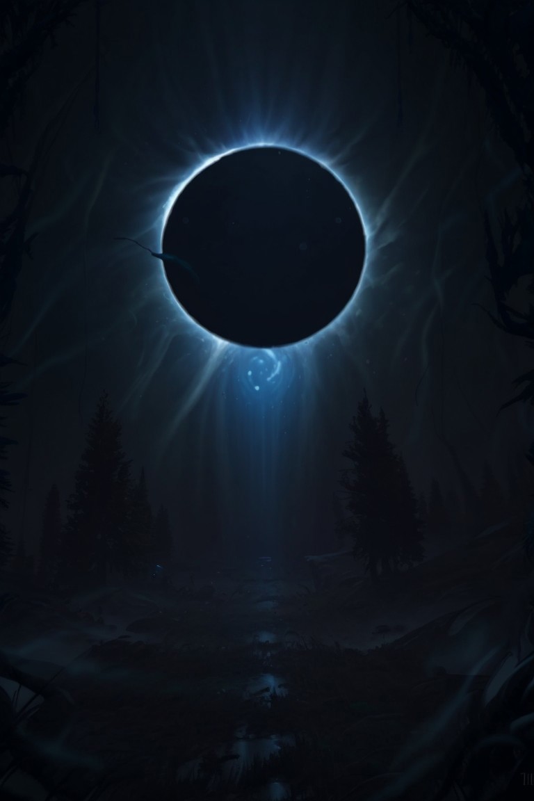 volumetric lighting, unreal engine 5, surreal, hyperrealistic, high definition, detailed, on forest ,dark blue neon eclipse on sky, sun eclipse, eclipse, dangerous waves , natural lighting, cinematic camera shot , blue eclipse