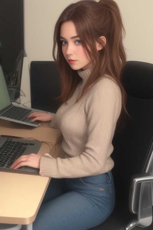 high-quality, masterpiece, score_9, score_8_up, score_7_up, detailed background, volumetric lighting, vibrant colors, solo girl, girl working at a office desk, laptop, laptop on desk, girl sitting on a chair, girl installed on a chair, 1girl, beautiful girl, perfect face, beautiful eyes, beautiful face, very thin, wide hips, beautiful big breasts, perfect hands, four fingers, one thumb, perfect face, girl sweet expression, girl parted lips, girl 20 years old, blue eyes, blue eyes, high ponytail, very long hair, hair length low back, orange hair, dark navy blue jeans, sweater, multicolored sweater, three-tones sweater, beige sweater, dark brown sweater, light brown sweater, easynegative, negative_hand, Expressiveh, good_hands,