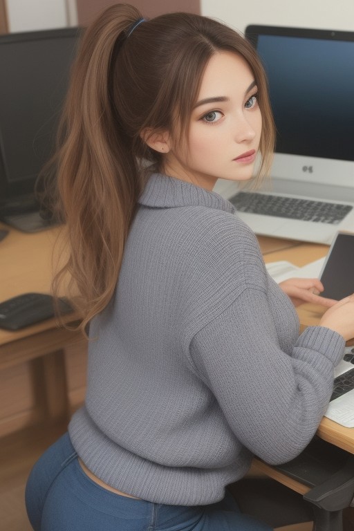 high-quality, masterpiece, score_9, score_8_up, score_7_up, detailed background, volumetric lighting, vibrant colors, solo girl, girl working at a office desk, laptop, laptop on desk, girl sitting on a chair, girl installed on a chair, 1girl, beautiful girl, perfect face, beautiful eyes, beautiful face, very thin, wide hips, beautiful big breasts, perfect hands, four fingers, one thumb, perfect face, girl sweet expression, girl parted lips, girl 20 years old, blue eyes, blue eyes, high ponytail, very long hair, hair length low back, orange hair, dark navy blue jeans, sweater, multicolored sweater, three-tones sweater, beige sweater, dark brown sweater, light brown sweater, easynegative, negative_hand, Expressiveh, good_hands,