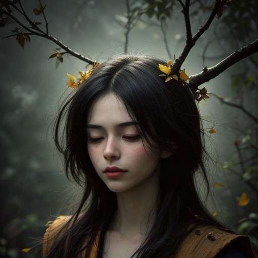 A vivid full-color surreal portrait, where the samurai’s shoulders sink into tangled, dark roots, their surfaces layered with peeling, deep-red bark that crumbles at the edges. Her neck is a sturdy but weathered tree trunk, split in places where fresh golden sap oozes from deep cracks. His face is serene, eyes closed, but from his scalp, a tangled mass of autumn-yellow branches rise into the air, covered in vibrant, green leaves. The wind pulls at her canopy, making her leaves scatter into the sky, their colors bright against the deep colorfull storm clouds rolling in the background. The world around her is in transition, cool, nice, pakistan,