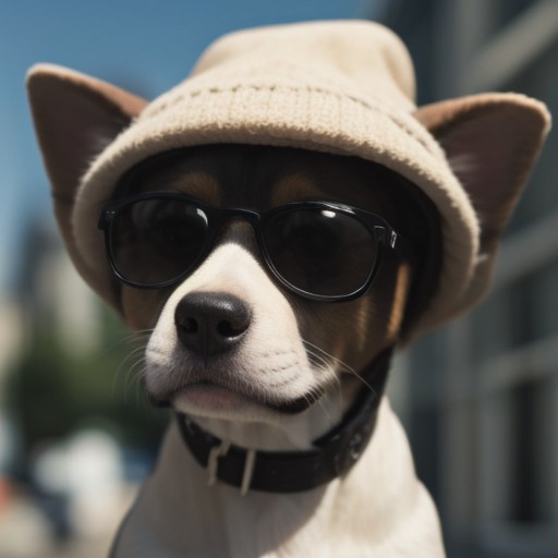 Close-Up cute dogs with a Wide Angle Lens Wearing Hats and sunglasses,