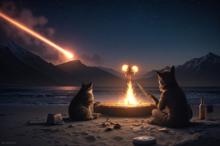 (((area 51))), war of teh worlds, tripods, ufo, apocalypse, cat, crown, many cats, chibi, cute, sparkles, cat, food, machine, mouse, war,, bullets, gun, rpg, blood, fire, waste, trash, (night beach volcano mountain background), building, beer, vodka, whiskey, scotch, blood, fight, ((((drunk)))), journal cover, text, (((big text))) rbyrdbyrunbrdyrby