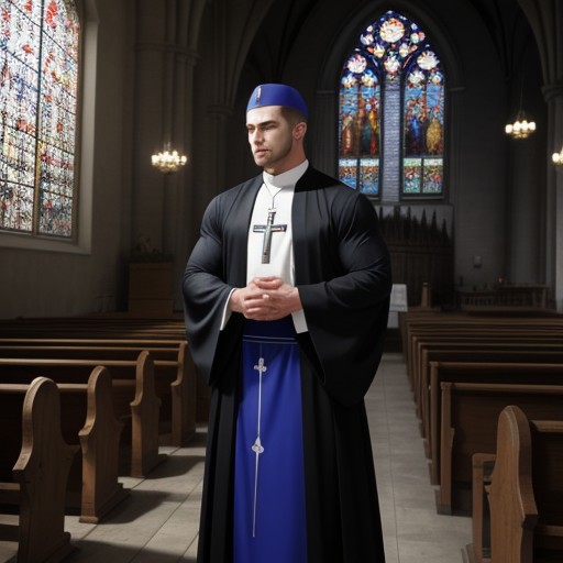 a beautiful 18yo male bodybuilder priest in a tight fitting black silk cap sleeved priest robe with a plunging neckline showing most of his huge pecs and deep cleavage, full body shot, messed up style hair, cover model, skin details, inside a church, standing at the back of the church with his back against the wall behind the altar beneath an upside down crucifix with a muscular bodybuilder jesus, ultrarealistic, hyperdetailed photography, soft light, model look, looking right into the camera with a piercing gaze, arms raised to the sides as he flexes huge biceps, long hair, earrings, vibrant blue eyes, bulging muscles, vascular, beams of sunlight shine down on him from a window, his biceps muscles are huge, pews are crowded with muscular men who are praying, clean shaven, biceps are flexed and are massive