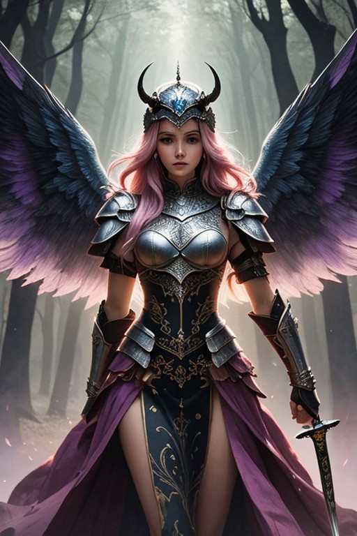 a stunning fantasy illustration of a powerful winged warrior standing in an enchanted forest. She wears intricate black and silver armor with elegant engravings, exuding both strength and grace. Her long, flowing pink hair cascades beneath a majestic horned helmet. Behind her, ethereal glowing wings with delicate patterns radiate soft pink and violet hues, illuminating the dark, misty forest. She holds a massive enchanted sword, its blade glowing with a mystical energy, gripped tightly in both hands in a solemn, commanding stance. The surrounding environment is shrouded in magical energy, with glowing purple embers and swirling mist enhancing the atmosphere. The scene is dramatic, with cinematic lighting and a sense of divine power, capturing the essence of a celestial warrior queen.