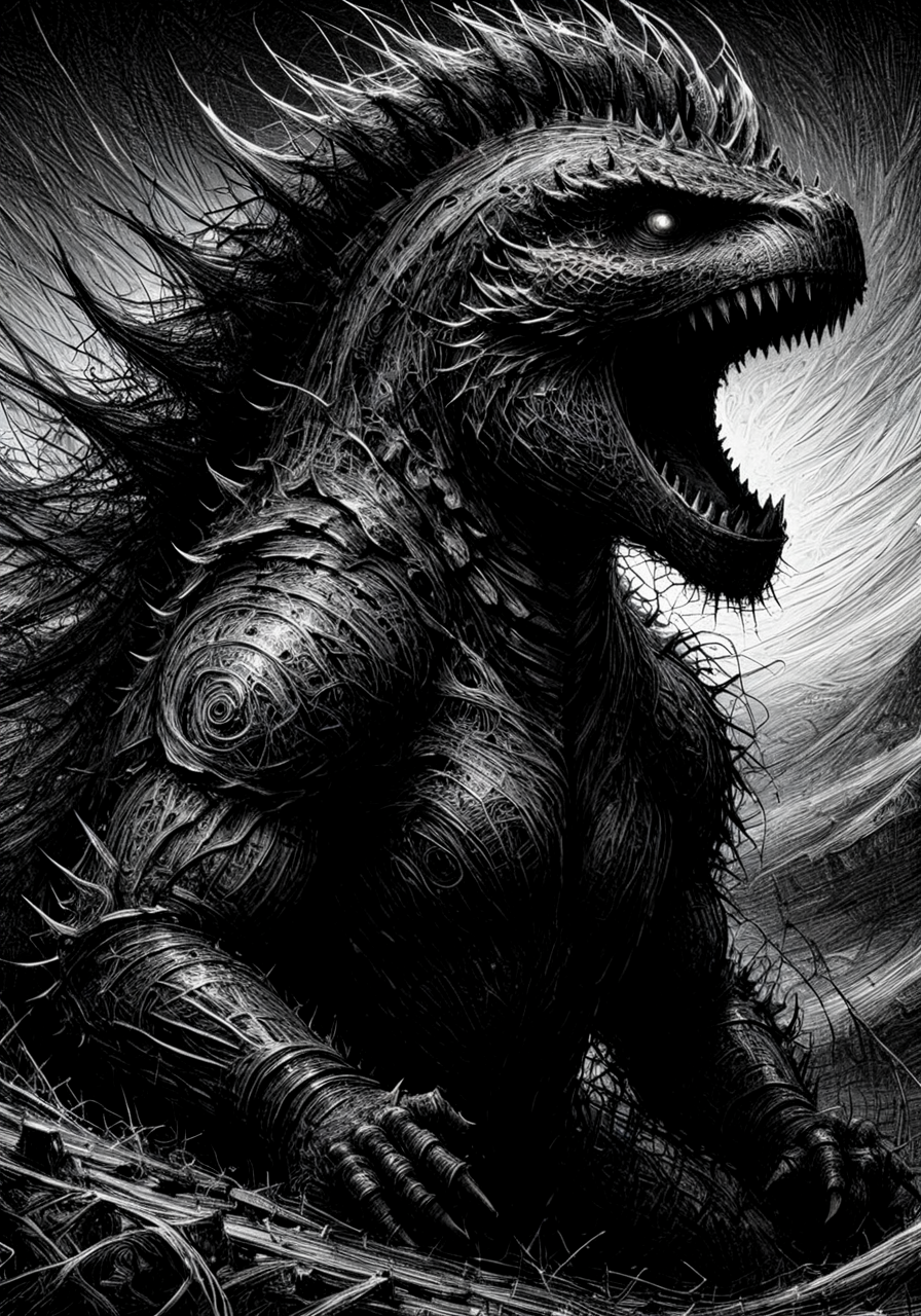 realistic, masterpiece, 4k, 8k, extremely detailed, sharp outlines, high contrast, fine details, intricate, black and white, doodle, messy, hard lines, (scribble:1.5) , sketch, Drawing, analog noise, retro color, godzilla, riding scenery , , ScribbleRay<lora:- SDXL - vanta-black_contrast_V3.0.safetensors:0.36:0.36> <lora:sdxl1.0\ScribbleRay-v2-000006.safetensors:2.0:2.0> <lora:Fantasy with epic details - XL SDXL v1.0.safetensors:0.4:0.4>