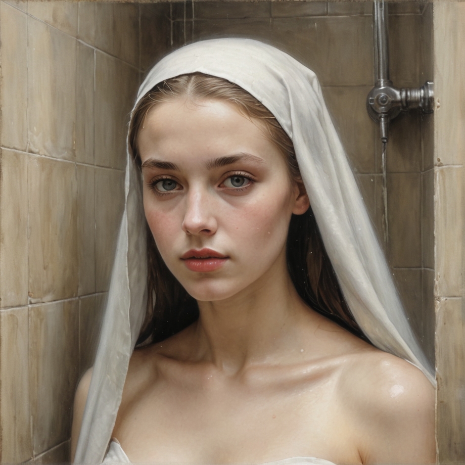 (masterpiece,best quality:1.5),1girl,nun,,in a shower,,, (style of alan lee:1.5)