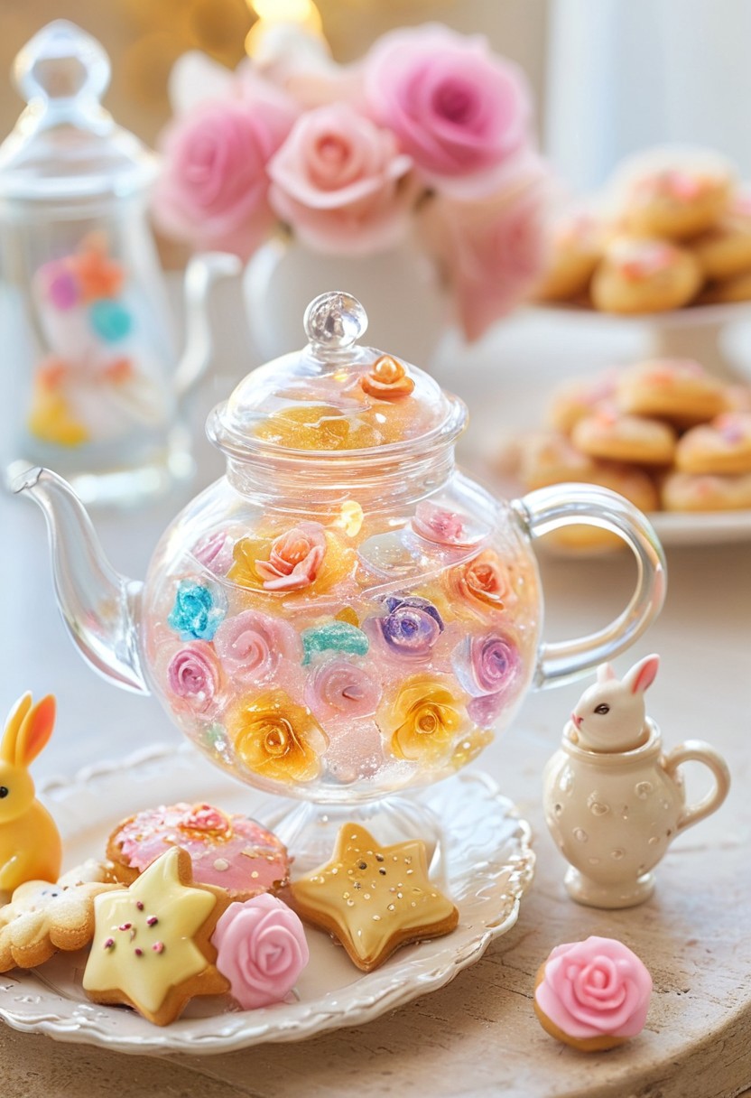 A charming tea party set in a whimsical, dreamlike world where everything is made from radiant fused glass. A delicate, glass teapot filled with shimmering golden liquid sits atop a stained-glass table, reflecting a soft kaleidoscope of pastel colors. Tiny fused-glass pastries, shaped like glowing crystal roses and shimmering star cookies, glisten in the gentle sunlight. Small glass animals—bunnies, birds, and cats—gather around, their tiny translucent forms glowing softly as they sip tea from intricately carved glass cups. The air is filled with the soft hum of prismatic light, casting a dreamy, magical atmosphere. Fused Glass style, ultra-detailed, soft glow, delicate transparency, high contrast reflections, warm pastel tones, dreamy cozy ambiance.novuschroma54 style