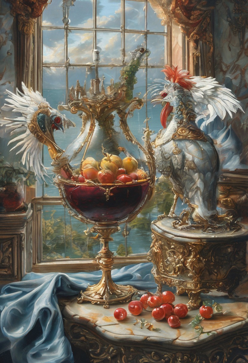 A still life in the style of 17th-century Dutch masters: Venetian mask with gilt edges and velvet texture, antique brass hourglass, crystal goblet filled with red wine, grapes with dewdrops. Dramatic Rembrandt-style lighting from a side window casting deep shadows. Through the window: a fantasy landscape — medieval castle with floating bridges and stained-glass towers, Baroque clouds (voluminous, illuminated by golden light), and a majestic dragon with iridescent scales soaring across the sky. Details: dust motes in light beams, cracked plaster walls, dragon's reflection in the goblet. Technique: oil painting with glazing layers, chiaroscuro contrast, hyperrealistic textures of aged wood and polished crystal.