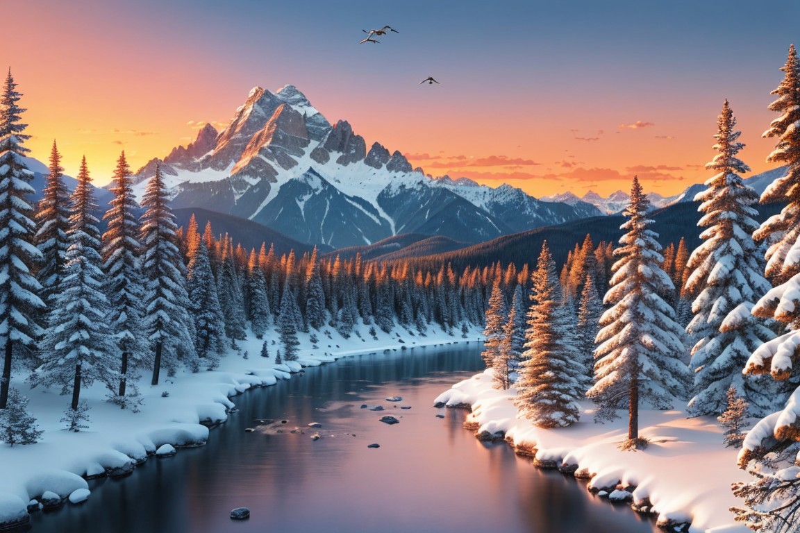 Photo realistic scenery, a flowing river, large mountains way back in the distance, snow capped mountains, a single story log cabin surrounded by trees, birds flying over the cabin, sunset, natural lighting, photo quality, realistic, detailed scenery