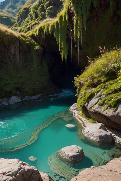 A sprawling valley of cascading waterfalls cutting through layered sandstone cliffs, viewed from a sweeping aerial perspective that reveals turquoise plunge pools and winding river networks. Golden-hour sunlight pierces mist rising from thunderous falls, illuminating intricate textures of water-smoothed rock strata and vibrant moss colonies clinging to vertical surfaces. Close-up details of fern fronds trembling in the perpetual spray, their fractal patterns echoed in the dendritic river deltas below. Low-angle shots framing monolithic cliff faces against swirling cloud formations, while tracking perspectives follow ibex traversing narrow ledges above abyssal gorges. Ultra-detailed 8k rendering captures every water droplet in mid-air suspension and crystalline reflections in ancient rockpools. A symphony of emerald, amber, and sapphire hues created by mineral-rich waters, lichen communities, and twilight's deepening azure gradients across the canyon's stratified geology.