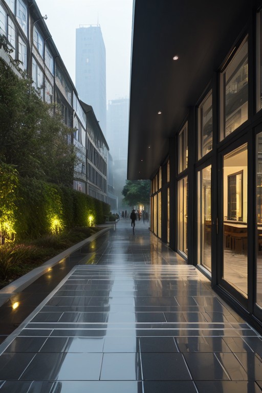 Melancholic European cityscape where contemporary and historical architecture blend seamlessly. A shadowed urban corridor on the left is defined by a classical building with repetitive openings, while a traditional gabled structure frames the right. In the background, a striking modern building with a faceted geometric form and metallic cladding rises, its transparent base glowing warmly through expansive glass panels and slender columns. Pedestrians navigate the cobblestone plaza, surrounded by delicate urban greenery that softens the transition between built space and nature. The damp ground reflects artificial light, enhancing depth and realism in the misty atmosphere.