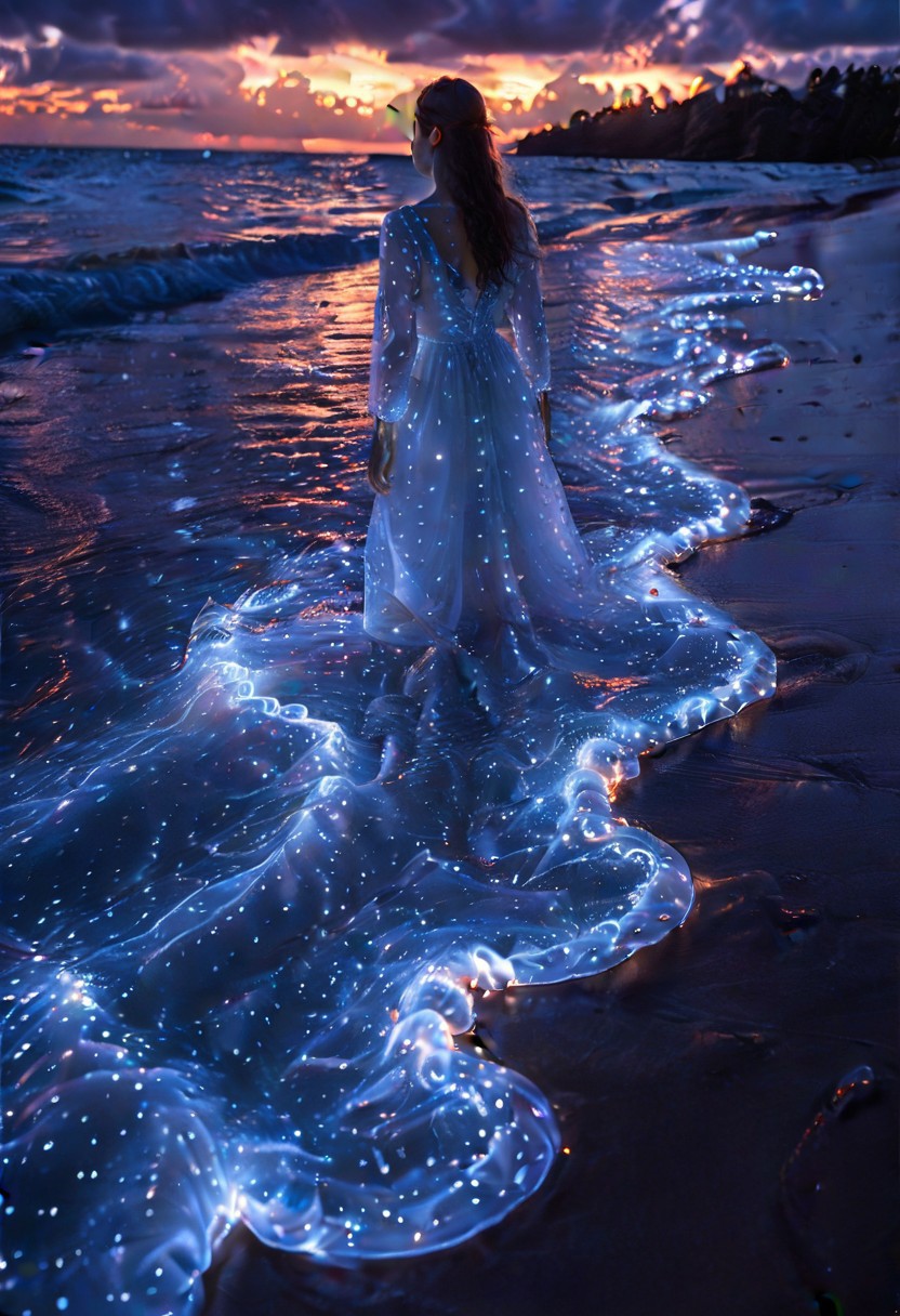 1girl, glowing adult woman, long flowing hair, dark, sunset, tentacles, outdoors, woman made of water, water woman in shallow water, pose, sundress made of water, translucent, masterpiece, adbsurdres, best quality, amazing quality, very aesthetic, luminous, bioluminescence, glowing, night, cloudy sky, swimming, reflection, reflective water, beautiful